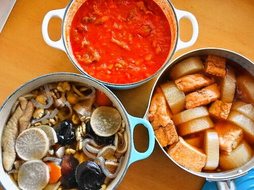 この日は、今年出版した『にっぽんのおかず』のカメラマンのカタギリさん、フードコーディネーターのウエダさんをお招きしての忘年会でした。 写真は前日からあれこれ仕込んで、一日休ませておいた鍋3つ。 出したものをメモしておきますね。 菊の花と、マツ…