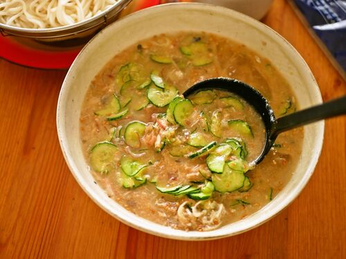 冷や汁はじめました 今季初の冷や汁。 作り方もいろいろですが、今回はサバ水煮(缶詰)と白ゴマを一緒にすって、オーブントースターで焼きつけた味噌と一緒に冷水で溶く、というやり方で。軽く塩で揉んだキュウリと、刻みミョウガをたっぷり入れています。 …